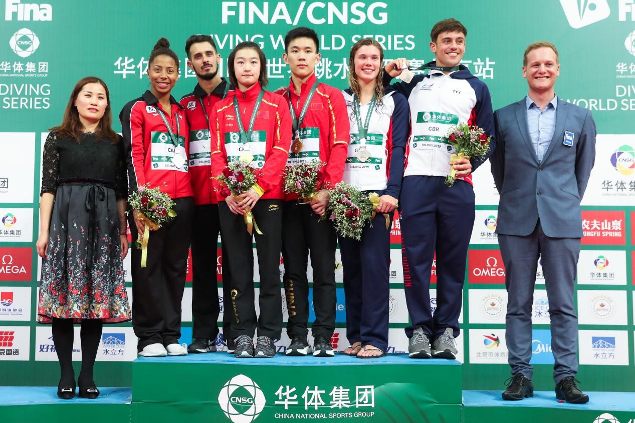 好視力科技董事長助理孫曉萍女士(左一)為男女混合3米跳板賽頒獎