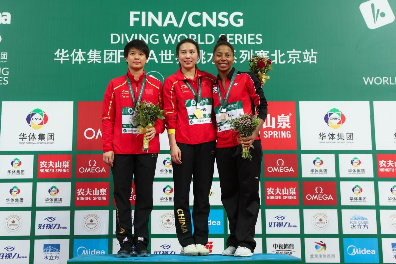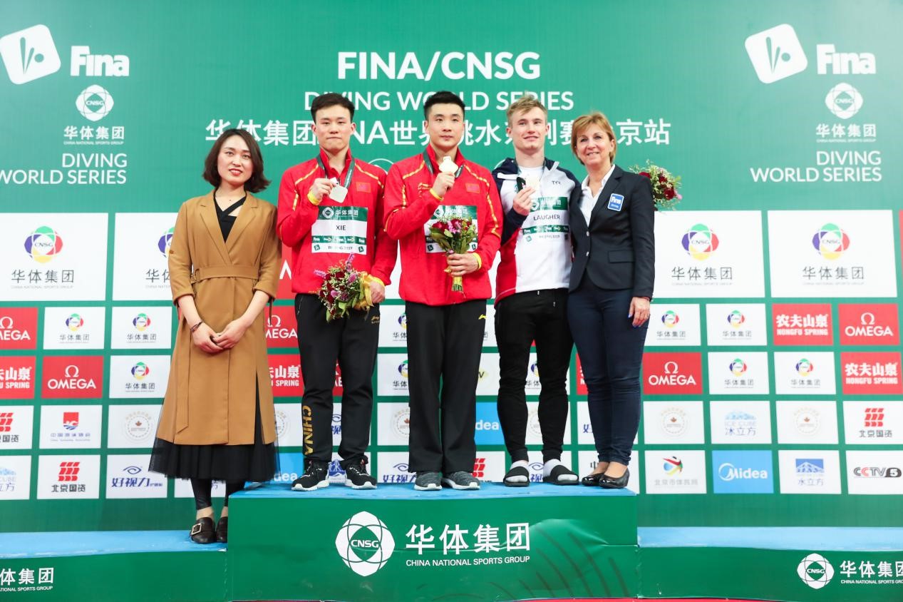 好視力科技策劃中心總監(jiān)王艷紅女士(左一)為男子3米跳板賽頒獎