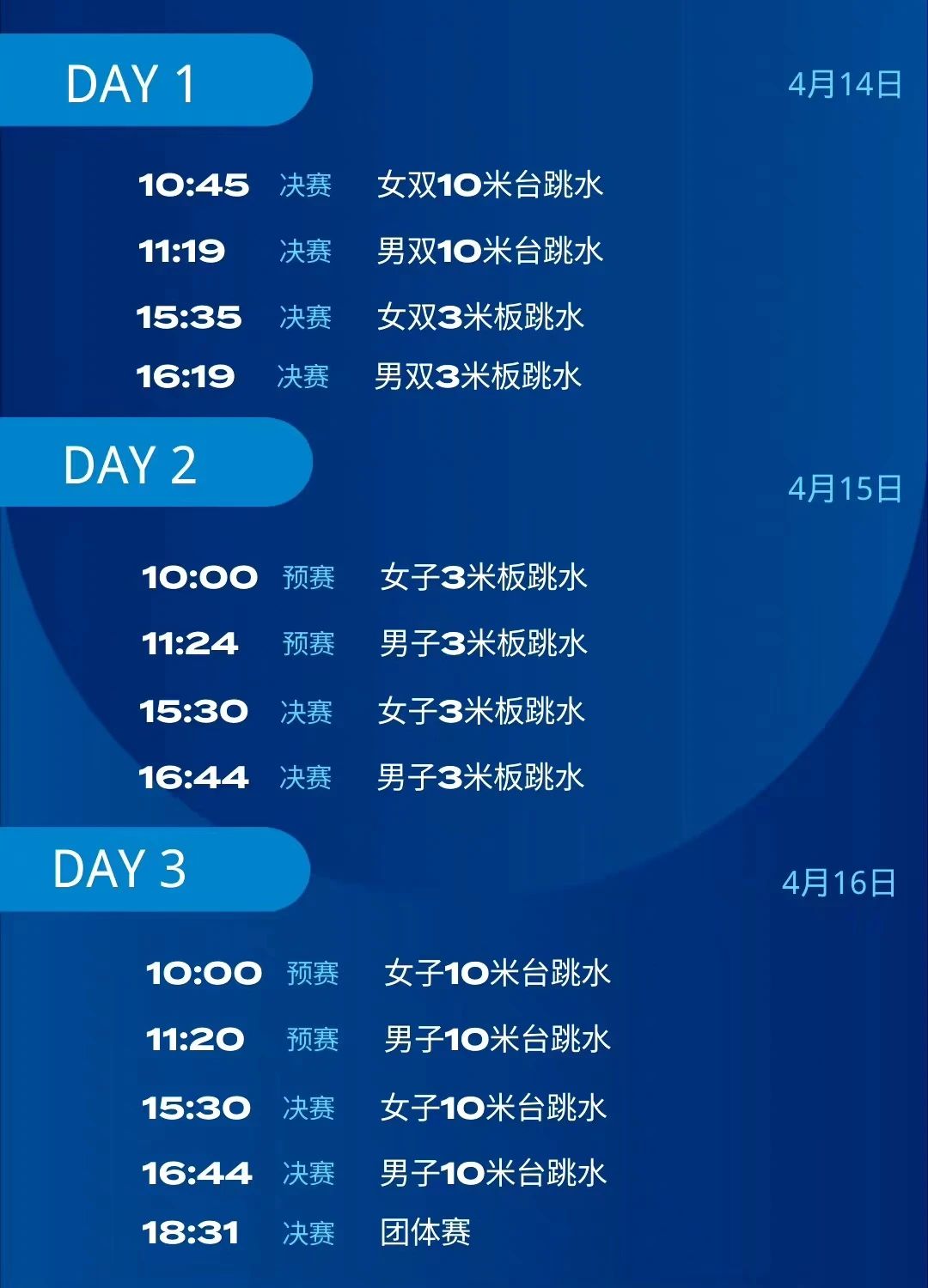 4月16日是2023世界泳聯(lián)跳水世界杯比賽的最后一日,有男/女十米跳臺以及團體賽三個項目,相信會有更多精彩的瞬間?。ㄏ聢D為賽事日程表)